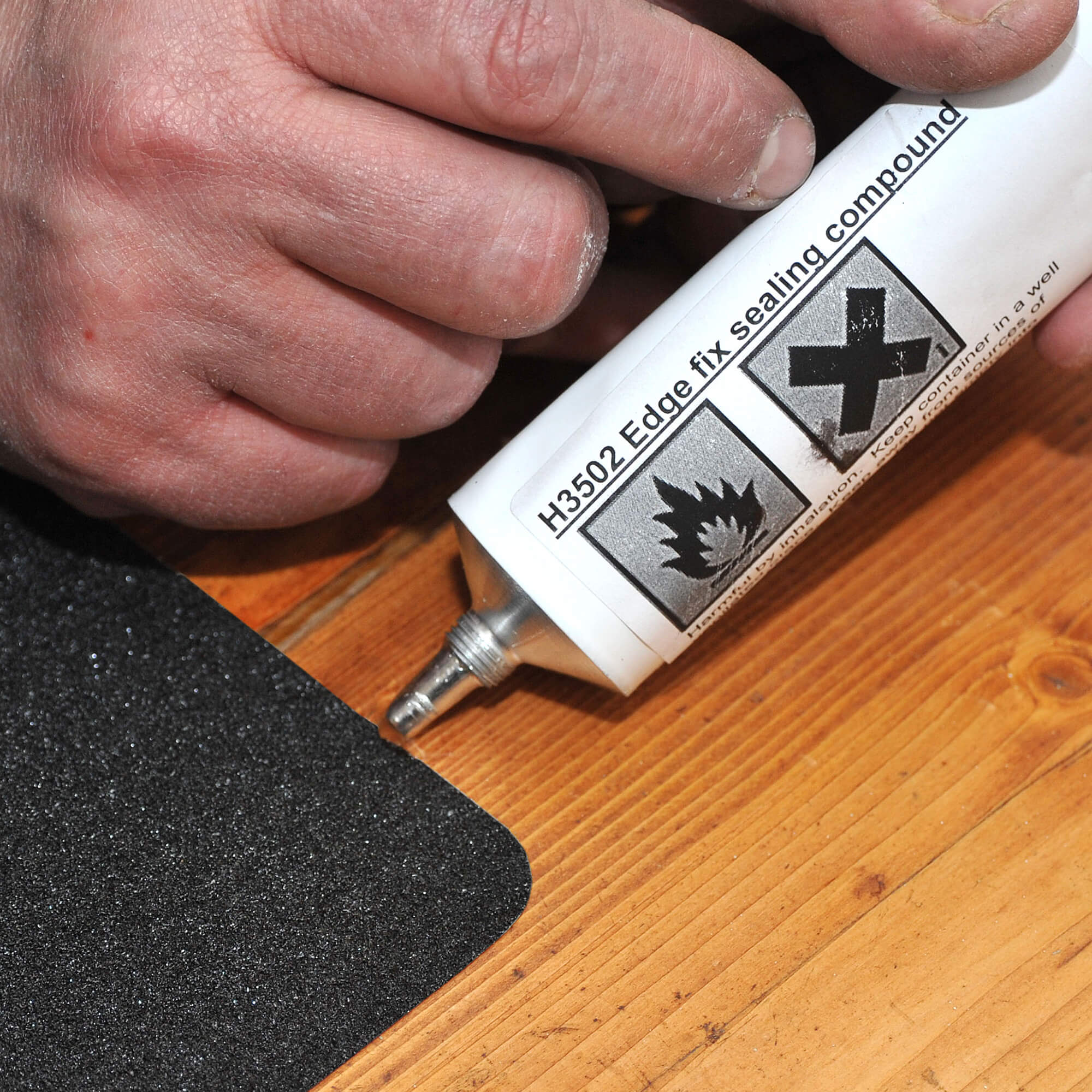 For use in heavy traffic areas or where there might be a lot of impact at sharp angles (for example one of our non slip stair treads on a stair nosing with high heels impacting onto the sides) we recommend edge fix sealer.